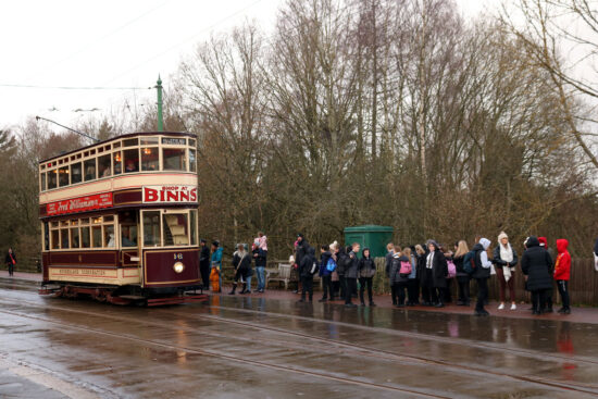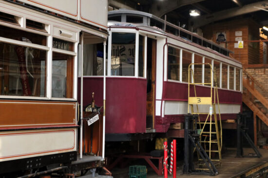 In this article we take what will probably be our last look at the trams running at Beamish – a wet 20th December 2022. This may have been a midweek day but with half a dozen school buses outside the museum it was a busy day with two (enclosed!) trams operating the service: Sunderland 16 and Sheffield 264. With the depot doors open it was also possible to grab a look at Gateshead 10 as its overhaul continues towards completion (hopefully at some point in 2023) and it now firmly looks like a Gateshead car and not a Grimsby & Immingham one once more now. Trevor Hall is the photographer for these latest images.