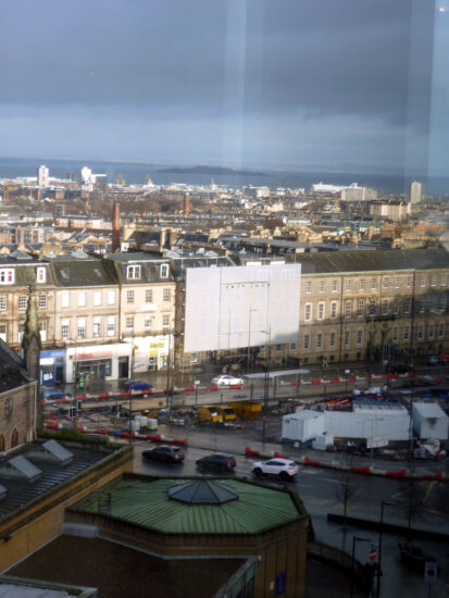 This view looks down on Picardy Place and we see the island platform in the centre of the image (with shelter in place) on the north side of the reshaped traffic island. Trams for Princes Street and thence the Airport will use the nearside platform and run left in this view with those to Leith and Newhaven using the far platform edge and head right. Beyond the tramstop are buildings in Picardy Place including Holiday Inn Express on the right while the centre building is being converted to another hotel. On the bottom left is St Mary’s Catholic Cathedral and halls. The background of the shot shows Leith including the large white Estonian cruiseferry “Victoria 1” in Imperial Dock which has been chartered to house Ukrainian refugees. The locations of two further tramstops can also be seen: Foot of the Walk is adjacent to the single block of flats on the far right and Ocean Terminal is between the two blocks of flats on the left. (Photograph by Roy Calderwood, 29th December 2022)