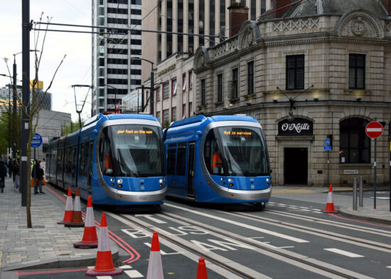 A previous extension on the West Midlands Metro – and the latest extension to open on a UK tramway – was that to Edgbaston Village. On 12th May 2022 testing took place along Broad Street which included two trams running in the same direction on gauging tests, electrical surge and load testing. The two trams were 39 and 40. (Photograph by Roland Bull)
