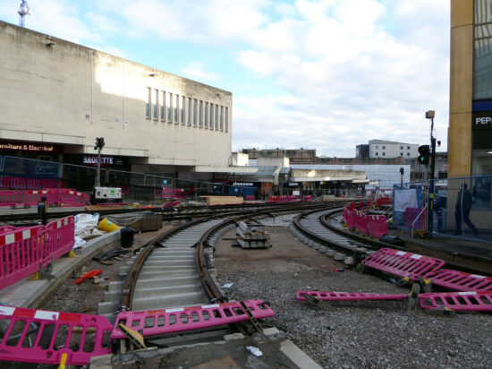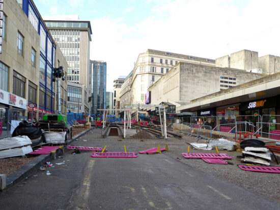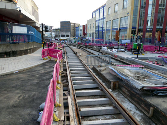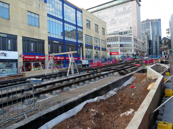 Initial work on the Eastside extension got underway in spring 2021 with the first major works taking place later that year when the delta junction linking it to the current city centre line between Bull Street and Corporation Street was installed. Since that the first tracks were laid in the final quarter of 2022 at Digbeth and since then more track has gone down at the city centre end of the line.