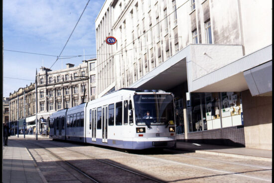 The below image was taken on 9th March 1995 and features the lowest numbered tram, 01, as it passes the C&A store with a service to Meadowhall. The C&A store would close in 2000 to be replaced by a Primark which has also now closed with an Easy Hotel located in part of the building. 01 was the seventh of the trams to arrive in Sheffield with its delivery being at the start of November 1993.