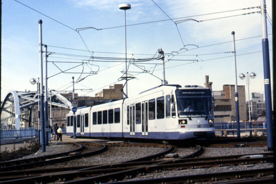 Taken on 9th March 1995 this photo shows 18 on the delta junction at Park Square with a service for Gleadless Townend (which as we’ve seen earlier in this series of photos was the limit of operations in this direction at this point in time). The driver checks to his left as the tram will turn towards us with the next stop being at Sheffield Station before it continues on its way to Gleadless Townend.