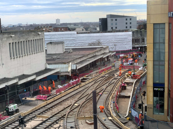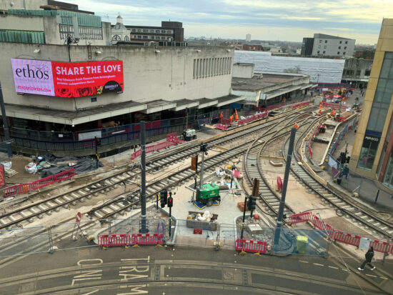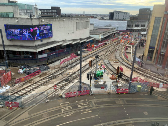 A different perspective of the delta junction showing the extent of the track installed on the Eastside extension. The current city centre line is seen in the foreground curving from Bull Street to Corporation Street with the new track seen going onto the extension. This excellent viewpoint shows the layout nicely.