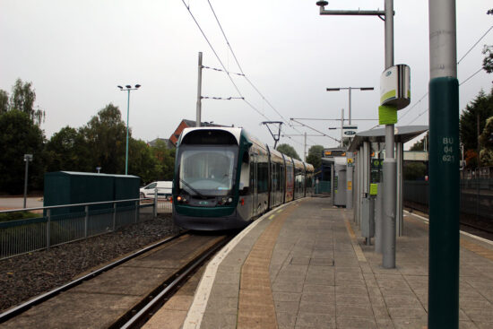 We’ve now left the Phoenix Park branch behind as its only the Hucknall line we follow, which still has the Robin Hood Line for company on the right. For much of the remaining route its now a single track tramway except when we come to the stops. When we arrive at Bulwell we have our first interchange station with the railway line. The railway station retains just a single platform (with just a single track) and can be accessed by leaving the tramstop and using a bridge. The tramstop itself features an island platform with tracks either side and has all the usual NET stop furniture and passenger information that we have come to see throughout our journeys.