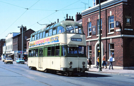 It’s a case of so many things have changed in the 45+ years since this image was taken. The tram is now a B-fleet Balloon (although saw very little use in this condition, probably the least of all the conversions) and the pub is standing but its now called The Bug. In the background Marks and Spencer – once the largest store in Fleetwood is long gone – and Fleetwood Pier (advertised on the tram) is also consigned to history having been victim to a fire in 2008 which saw it demolished.