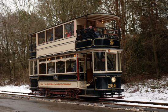 On Saturday 11th March 2023 there was just one tram in service at Beamish with open balcony car Sheffield 264 allocated to service. And yes despite the snow people still braved the balcony! We’re pretty sure if an open topper had been out they’d have gone upstairs on that too!