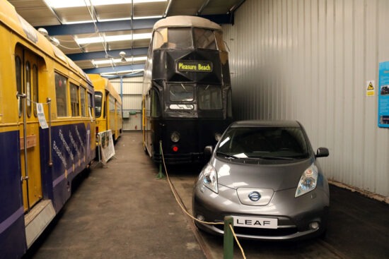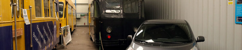 The Nissan Leaf is in front of Balloon 721 with the Bradford trolleybus out of sight behind. Centenary 647 is on the left and we also see part of the Twin Motor Car, 674, too.