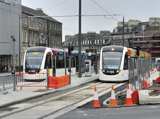A happier shot taken at Picardy Place compared to the one taken in the same position on Friday last and posted in British Trams Online on 19th May. These two trams are operating! The tram on the left heading for Newhaven and on the right for Airport, though it will not pick up any passengers until it gets to St Andrew Square. (Photographs x3 by John Hampton, 21st May 2023)