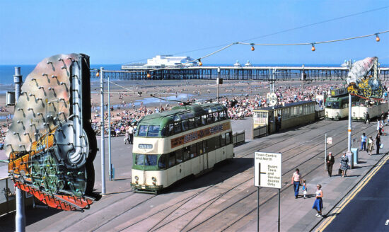 Summer days of the past in Blackpool with sunshine, crowds of people and traditional trams in action on the Promenade. This photo is taken from the old Tower bridge again and looks across the tram tracks with three trams in view – one now scrapped, one with a very uncertain future and one which now resides in the United States of America. It’s a corporate look for the trams too with all three in the traditional green and cream fleet livery.