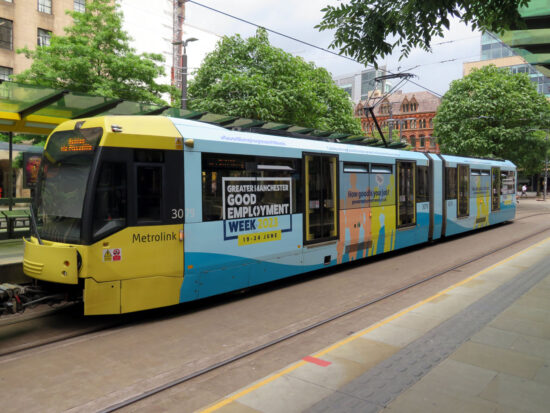 Having never carried an advertising livery before April this year, 3079 is now on its second in a couple of months after the expiry of its Soccer Aid ads. The tram is now in a new advert for the Greater Manchester Good Employment Week, although this also looks set to be a short-term advert.