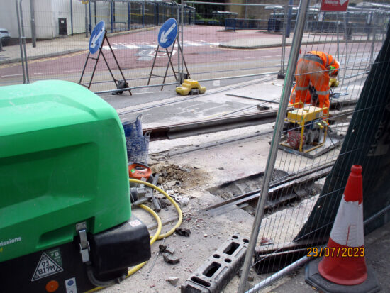 As we saw last week a period of rail replacement work is now underway on Stagecoach Supertram with the Hillsborough area the focus of attention. Getting underway from Monday 24th July the works will be continuing until Sunday 6th August with four distinct phases taking place. These latest photos come from phase two which has been close to Hillsborough Interchange.