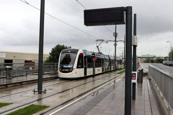 253 has just used the crossover mentioned above as it arrives at Newhaven tramstop on a wet 30th June 2023. Taken from the opposite platform (under the shelter!) it is just passing the signal which controls departures and we also see one of the validators and the passenger information display in the foreground.