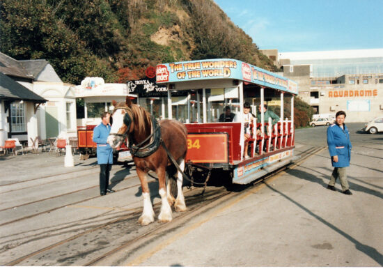 This is September 1990 and we are at the Derby Castle terminus of the horse tramway. It’s a case of an unrepeatable image for both the tram and the building in the background are no longer in situ. The tram we see is 34 which is including advertising for Golden Wonder crisps (“The True Wonders of the World”). 34 was sold as part of the reduction of the fleet once the Isle of Man government took over operation of the tramway and has since been converted to a road vehicle, often seen around the island and based at the Jurby Transport Museum. The building in the background is part of the once extensive Summerland complex, which had reopened in 1978 after the tragic fire of 1973. It finally closed in 2004 with demolition underway two years later although still to this day parts remain due to its proximity to the cliff.