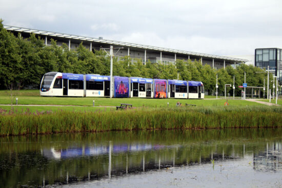 The reverse side of the advert as the tram approaches Edinnburgh Park Central on the way to Newhaven.
