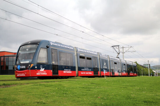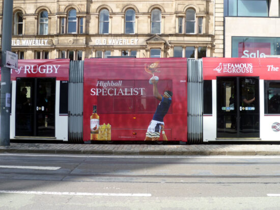 Strangely the other new advert can be seen on 254 – which like 268 has had two previous adverts both for Edinburgh Park! The tram is now advertising The Famous Grouse “Spirit of Scottish Rugby” with the whisky company sponsoring the Summer Rugby Internationals taking place at Murrayfield Stadium as part of their wider rugby sponsorship. The ad features a dark red background and includes the slogan “Highball Specialists”.