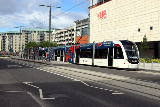 After we depart from Newhaven (depending on which platform you’re at you may use the crossover to gain the right track) the tramway initially travels on a short section of reserved section of track before it starts to share the road with other vehicles. It goes along Melrose Drive (views of the Royal Yacht Britannia can just be seen if looking left just after the Cruise Terminal) before a sharp turn left onto Ocean Drive. With the Ocean Terminal shopping centre dominating the scene to the left we soon come to the first intermediate stop on the extension – Ocean Terminal.