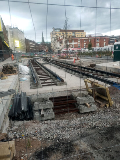 Our attention construction wise on the West Midlands Metro is being taken by the Wolverhampton Railway Station extension at the moment but that doesn’t mean that work on the two other extensions has stopped. In this article we take a look at a couple of photos of recent work on the Birmingham Eastside extension.