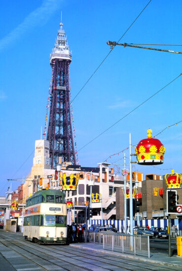 We are in October 1977 for the below photo and its one of those classic tram and Tower scenes. At this time the top of the Tower was painted silver to mark the Silver Jubilee of Her Majesty Queen Elizabeth II and the roadside illuminations are presumably also celebrating this milestone.