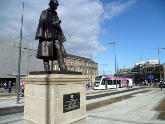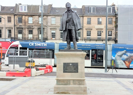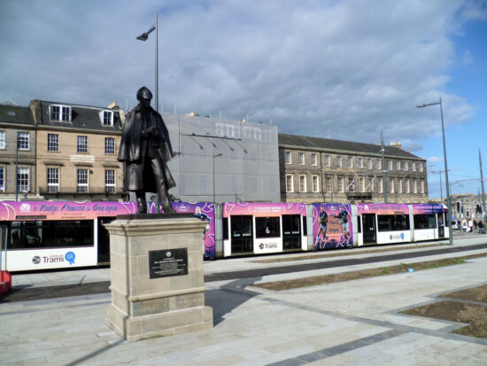 This article is another case of us preparing an article to be published whilst away on holiday and then things changing so it was more or less out of date before it was even published! The last part of the first series of “Stop by Stop: Edinburgh Trams” featured Picardy Place and we mentioned in that article that things were a bit constricted around the stop with public realm works ongoing at the traffic island – and then it reopened with the Sherlock Holmes statue put in place too! We bring things up-to-date with this pictorial article.