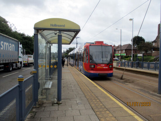 Located on the central reservation on the A6102 Ridgeway Road the stop at Hollinsend is served by trams running on both the Blue route between Halfway and Malin Bridge and the Purple route between Herdings Park and Cathedral. 124 was on the Blue route when seen departing from the stop heading to Halfway.
