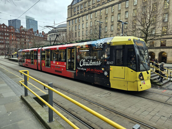 3047 has now lost its adverts for Marc Jacobs but has not returned to fleet livery with it currently carrying vinyls encouraging people to use the greater Bee Network for travel this Christmas. Featuring a black and red base colour it also uses the slogan “Together at Christmas. That’s why we get on board”. The tram is now on its fourth advert and third of 2023: Vodafone (June 2018-December 2019), Soccer Aid (April-August 2023) and Marc Jacobs (September-December 2023) being the others.