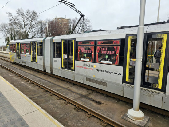 Retaining its standard fleet livery, 3081 has received some advertising for Brief Encounter which is the show over the festive period at the Royal Exchange Theatre (which is on the route of 2CC and so trams pass it every day). This photo shows the detail of those vinyls. (Both Photographs by Michael Morton, 15th December 2023)