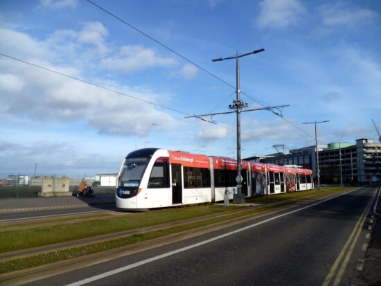 255 is seen here on Ocean Drive not long after it had left Newhaven bound for the Airport. This is the side of the tram which has received new adverts for Forever Edinburgh. (Photograph by Roy Calderwood, 27th January 2024)