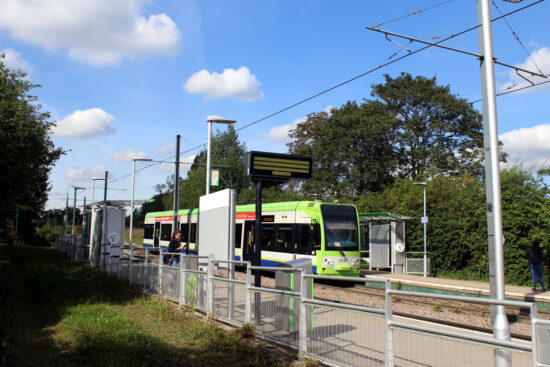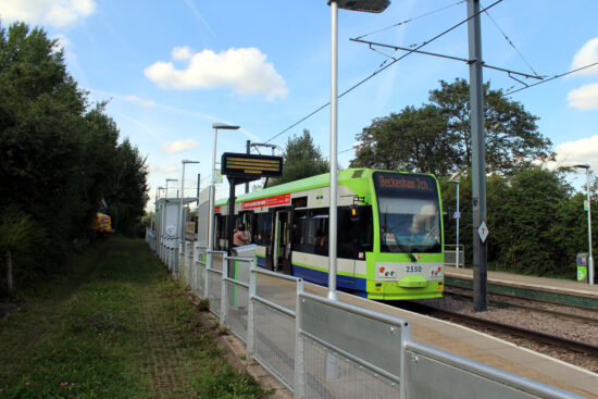 After the tram departs Birkbeck (most likely your journey will be destined for Wimbledon) we run alongside the railway line to Crystal Palace until we part as the train goes off to the right and we take a sharp turn to the left. It remains single track until we drop down towards the next stop when its double track all the way to Croydon. If you’re heading on a tram towards Beckenham Junction you may be held just beyond Harrington Road as you wait for a tram to come off the single line section. But we’re heading the opposite way so that doesn’t concern us as we coast into the tramstop. For the first time since Avenue Road we have platforms either side of the tracks here – and they both have everything we come to expect including shelters, validators and passenger information displays. When we arrive at the stop there is access to Beckenham Cemetery just beyond the platforms.
