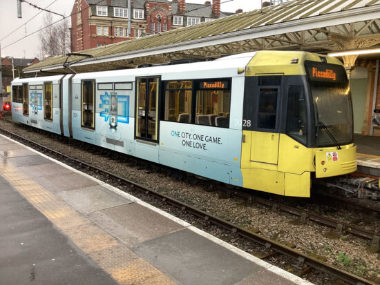 The recent influx of new adverts on trams in the UK shows no signs of abating with another tram in Manchester now carrying vinyls instead of standard fleet livery. 3028 is the tram and it’s a first for it as it hasn’t previously had an vinyl wrap.
