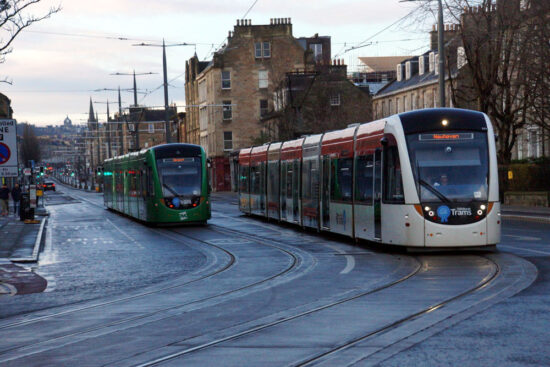 On 2nd March 2024 two of the trams in the fleet of Edinburgh Trams are seen passing with their services showing the full vinyl wrap and the partial adverts that all trams carry. Approaching us on the right on the way to Newhaven is 277 whilst 276 in an wrap for OVO Energy is moving away from us to the Airport. (Photograph by David Mee)