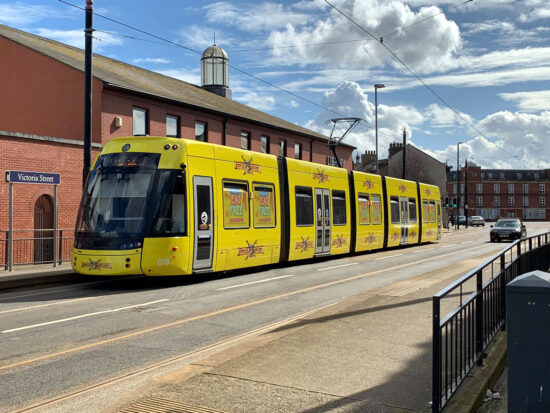 The new vinyls – which are very yellow! – have been directly applied on top of the expired advert for Pretty Little Thing. The previous pink adverts had been on the tram for over five years (originally stuck on in August 2018) but the contract had reportedly expired some time ago. Of course, 016 wasn’t the only tram to advertise Pretty Little Thing with 003 also doing so between August 2018 and December 2023 (this is now back in fleet livery).