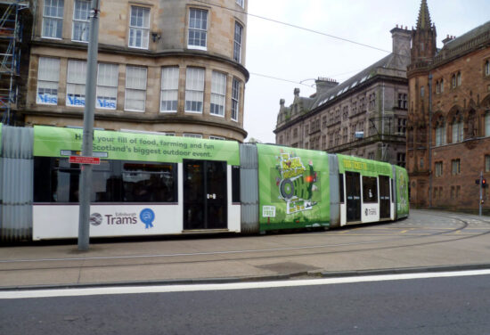 This latest advert for The Royal Highland Show is of the partial type (full height on two sections of the tram only and the rest just above windows) and makes a lot of use of yellow as its base colour.