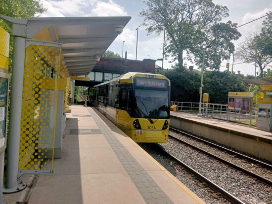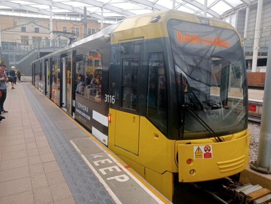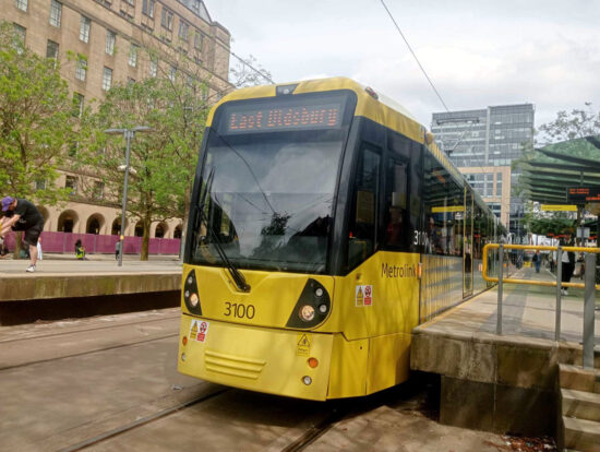 3100 stands at St Peter’s Square on 13th May 2024 having returned to service after nearly two years. It was working on the East Didsbury service on this day which is now back to running via 2CC again. (Photograph by Reece Hughes, 13th May 2024)