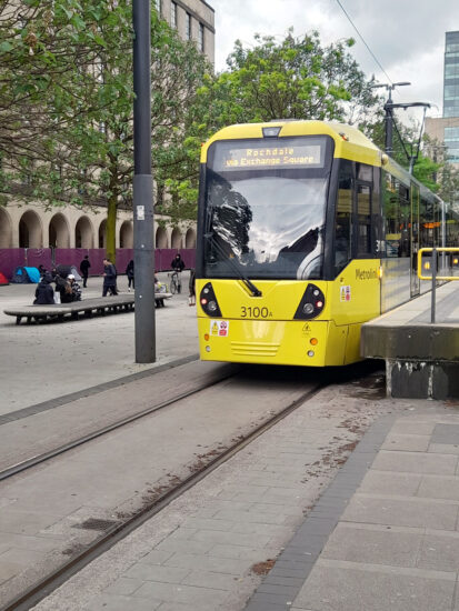 Another photo of 3100 – this time 24 hours later – as it comes back through St Peter’s Square bound for Rochdale. (Photograph by Philip Gay, 14th May 2024)