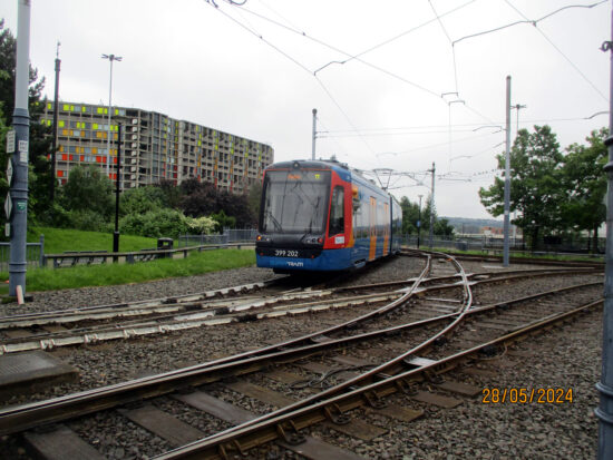 The Tram Train service is currently running between Rotherham Parkgate and Sheffield Station or plain old Station according to the destination display on 399 202. Its just come off the line to Hyde Park and now heads over the delta towards the Station.