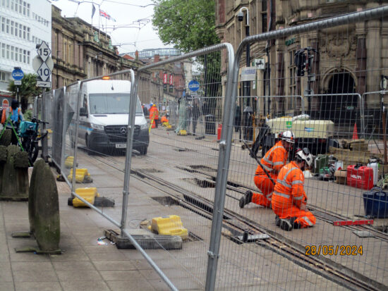 This is the latest in our look at the trackwork taking place on the South Yorkshire Supertram system in and around the city centre. As we’ve reported before the work is taking place during the May Half Term school holidays and has meant that no trams are able to run through the city centre. Stuart Cooke provides the images.