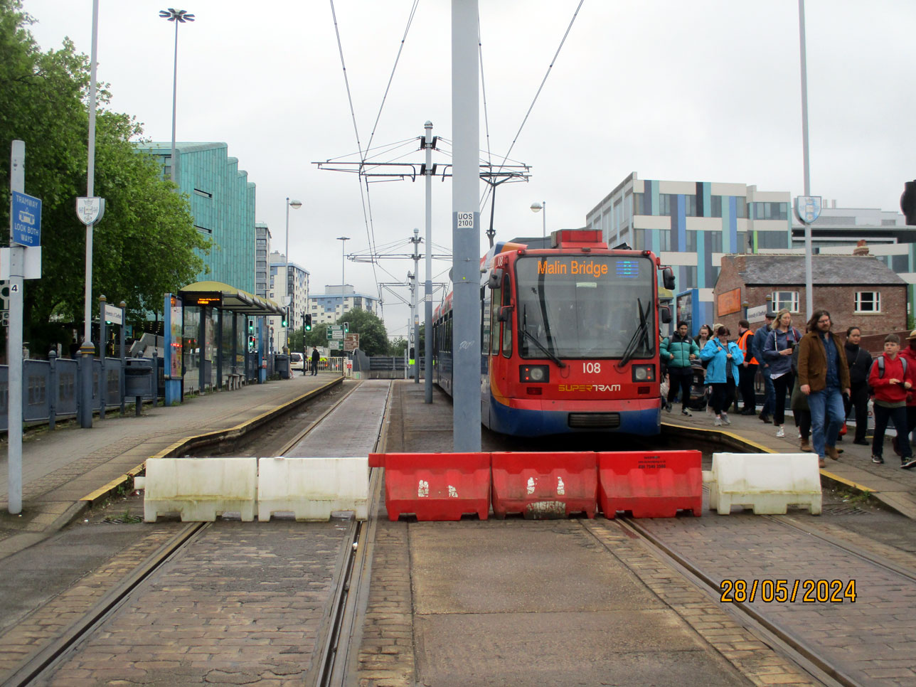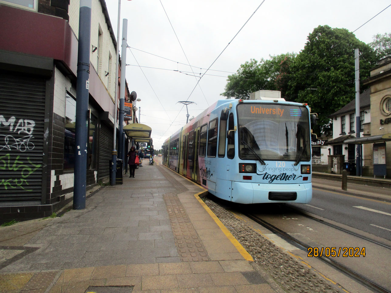 The other side of the worksite and more unusual destinations on the tram. 120 in its special inclusion livery stops at Hillsborough with a Blue route service to University (of Sheffield).
