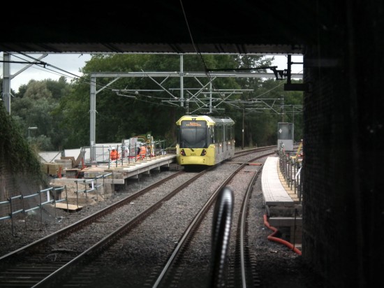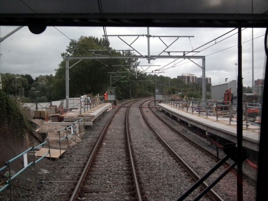 Work at Queens Road to construct a new stop continues with the platform structures now starting to take shape. This stop will replace the current staff only halt alongside the depot and will also enable Metrolink to close the stop at Woodlands Road. With thanks to Steve Kemp we are able to bring you some images taken from on board a tram showing the latest progress at Queens Road.