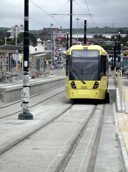 As previously reported the first tests in Oldham town centre took place over the past week as preparations continue for this extension to join the Manchester Metrolink network. Two trams have been involved in the tests – 3067 and 3069 – and these vehicles have been left stabled overnight at the new Oldham Mumps stop. Photos courtesy of Steve Kemp show these trams at rest.