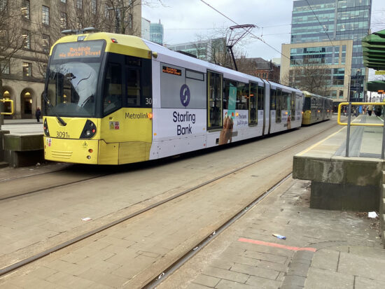 In March 2024 two trams in the Manchester Metrolink fleet received adverts for Starling Bank, one of which was 3091. The plain white advert marked the return to advertising on the trams for the bank who previously advertised on a couple of trams in July and August 2022. On this visit 3091 was part of a double unit with a service to Rochdale via Market Street when seen at St Peter’s Square. (Photograph by Geoff Hope, 11th March 2024)
