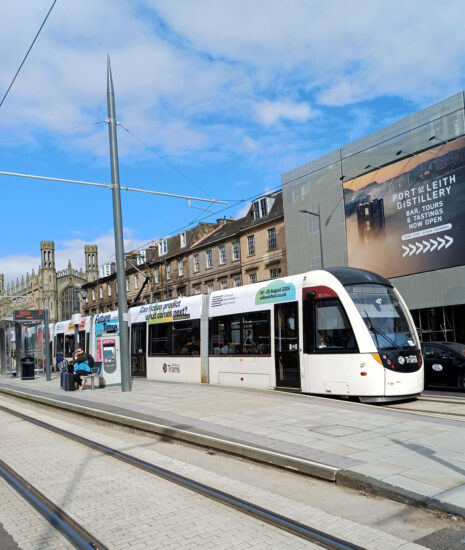 As with its previous advert this is of the “original Edinburgh” style, meaning that its not a full wrap but merely sees full height adverts on two sections of the tram with the remainder just seeing vinyls applied above the windows. It’s a fairly simple advert using white as the background with a bit of added colour on the full height sections.