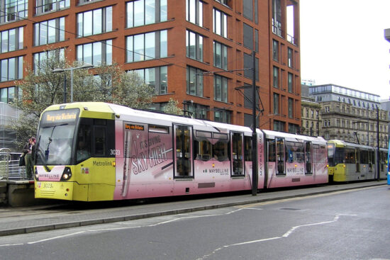 Between February and April 2024, Manchester Metrolink M5000 3023 carried a vinyl wrap advertising livery for Maybelline. As well as including the usual bodyside vinyls the tram also had end dash adverts which saw the usual fleet number position revised to lower on the front. This photo was taken at Piccadilly Garden. (Photograph by Keith Chadbourne, 14th March 2024)