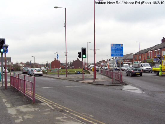 We look eastwards for this pair of photos and we’re on Ashton New Road at the junction with Manor Road which is where you will now find the Edge Lane tramstop.