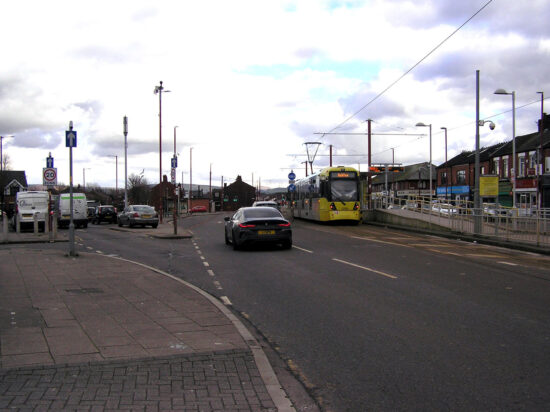 Things have changed by the time of the second photo as we now have a fully functioning tramway in place with the island platform of Edge Lane in situ. The road layout has changed a bit in the vicinity as well with it another one where you need to know where to look to see it’s the same place. (Both Photographs by Keith Chadbourne)