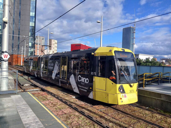 3075 approaches Deansgate-Castlefield on the way to Eccles. (Photograph by Reece Hughes, 6th August 2024)