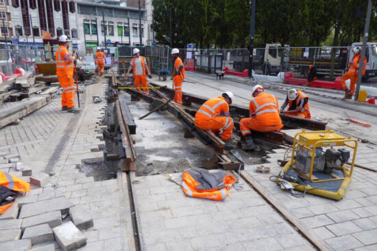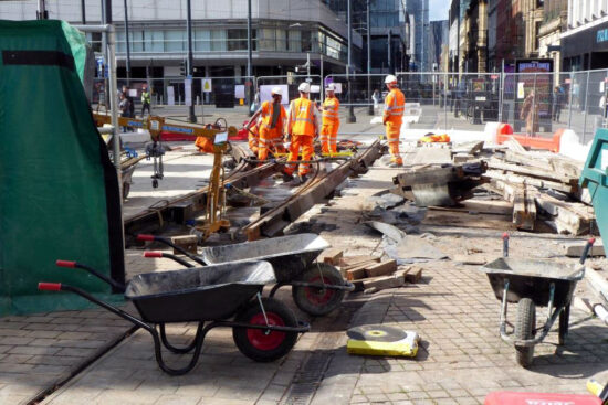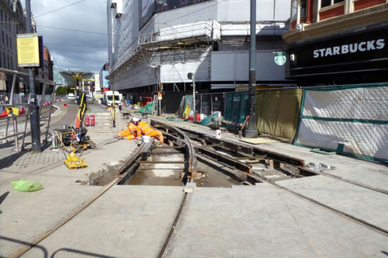 Recent progress has seen the conclusion of work at Shudehill with new track now in place there. Meanwhile, the work crews have moved on to a second phase which sees the points at Market Street and the trailing points from Piccadilly Gardens and Mosley Street towards Victoria replaced.
