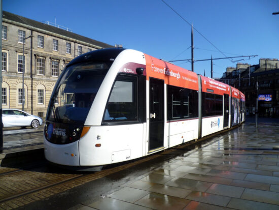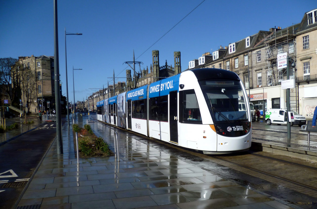 If you look overhead you would think that this was a pleasant early spring’s day but then look down at the pavement and its clear that it wasn’t quite like that as it was a case of dodging the showers! We’re at Picardy Place here as 272 (probably apt that it has adverts for Scottish Water!) calls on the way to the Airport. York Place is in the distance and St Paul’s and St George’s Episcopal Church can be seen above the tram.