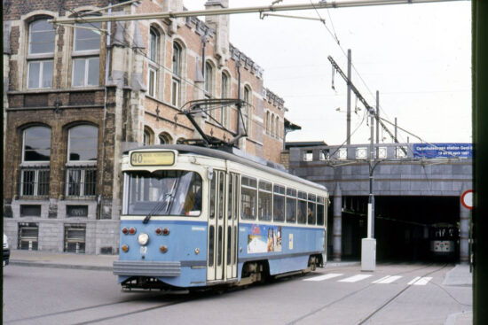 PCC style car 02 was built in 1971 and would run in Gent until 2018 (being modernised and renumbered 6202 in 2000/1) when it moved to Antwerp. But on 6th April 1997 it was still in its original style and running in what looks like a faded blue livery as it leaves the stop underneath Gent St Pieters Station working route 40 to Moscou.