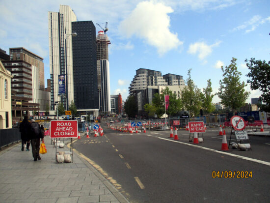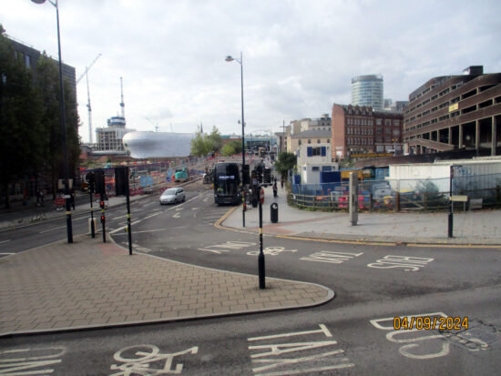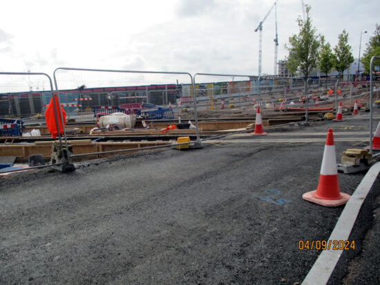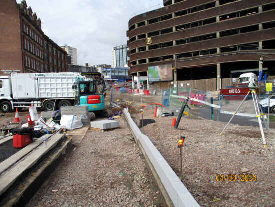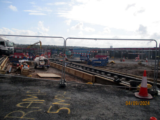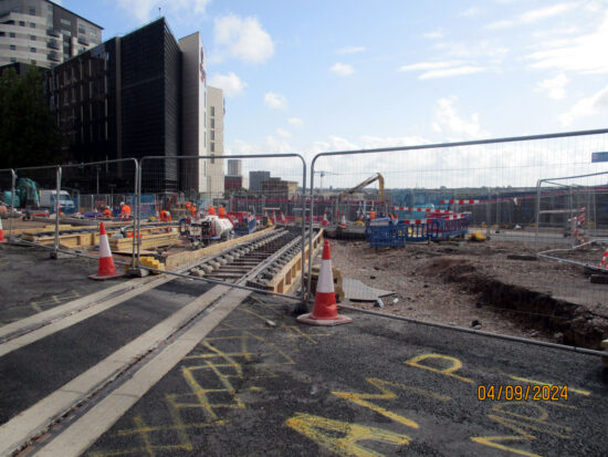 Moor Street Queensway in Birmingham City Centre will see trams running along it in the future as it is on the route of the Birmingham Eastside extension which will leave the current line at Bull Street and run through to Digbeth. As was first reported last month, good progress is being made on laying the tracks here with one side seeing rails on the ground and the Midland Metro Alliance team moving to the opposite carriageway. In this pictorial update Ken Jones takes a trip out to see the most recent progress.