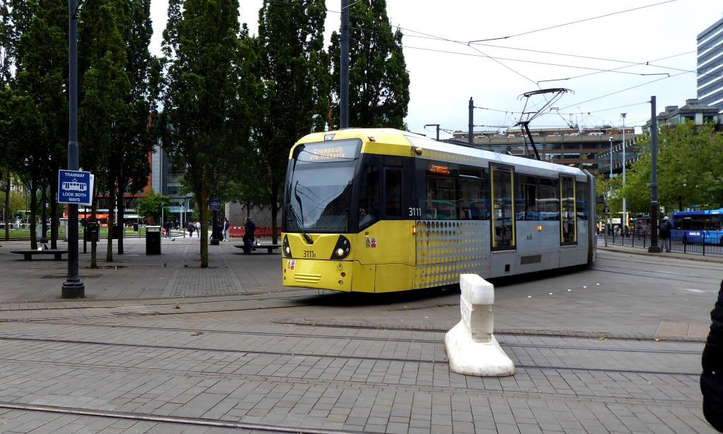 In Piccadilly Gardens 3135 is seen heading to Victoria on a service between Etihad Campus and Victoria diverted from MediaCityUK by the renewals work on the Delta Junction.